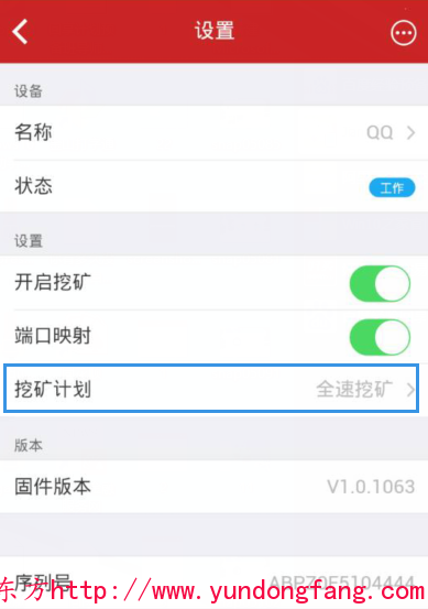 进入赚钱宝监控的界面,然后点击一台正在工作中的赚钱宝。在设置界面中就可以看到挖矿计划,在这里就可以调节挖矿的模式。
