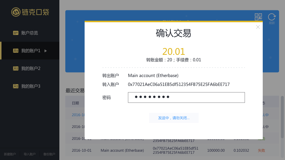 三、在确认交易的界面中检查交易信息,确认无误后输入密码,点击【确定】,等待发送完成